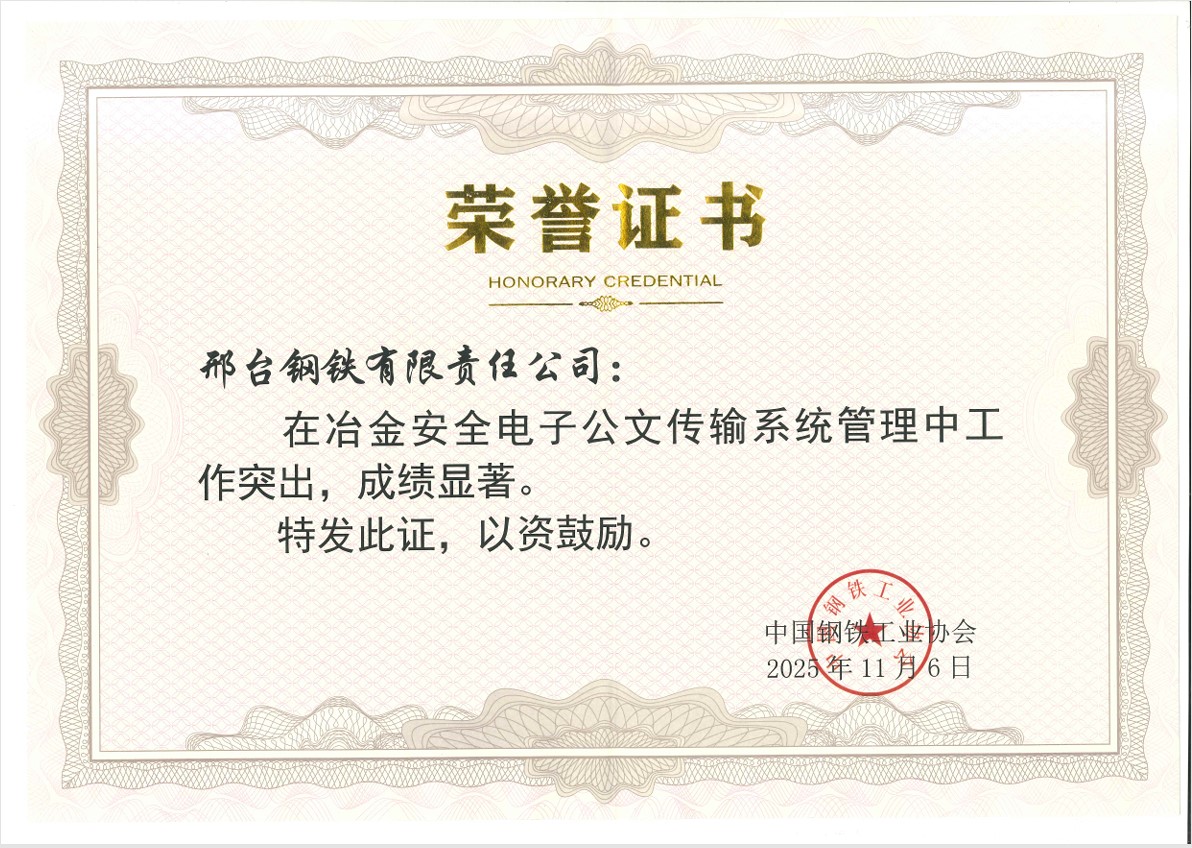 2025年11月,邢鋼在冶金安全電子公文傳輸系統(tǒng)管理工作中表現(xiàn)突出,被中國鋼鐵工業(yè)協(xié)會評為先進(jìn)單位。
