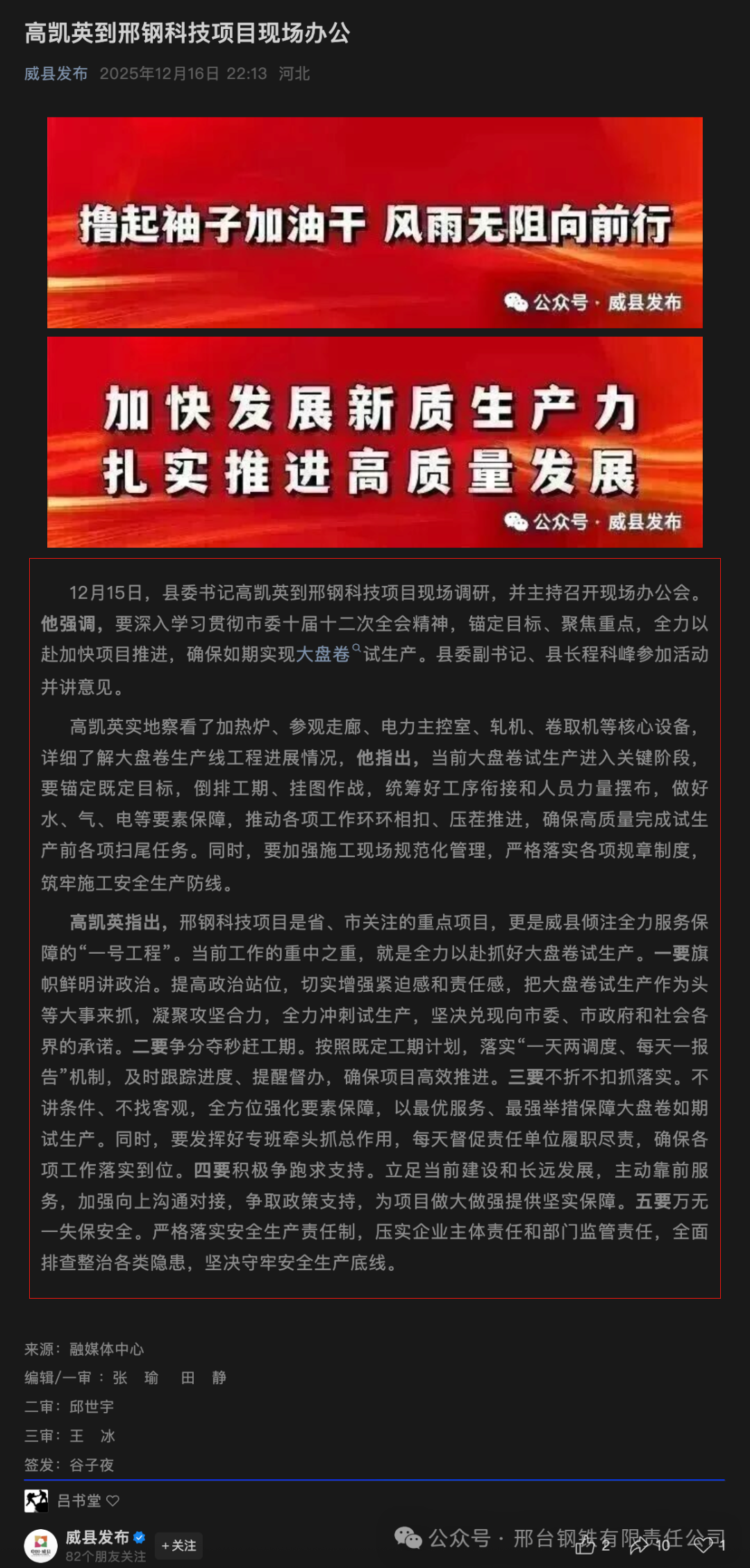 高凱英指出,邢鋼科技項目是省、市關注的重點項目,更是威縣傾注全力服務保障的“一號工程”。當前工作的重中之重,就是全力以赴抓好大盤卷試生產(chǎn)。一要旗幟鮮明講政治。提高政治站位,切實增強緊迫感和責任感,把大盤卷試生產(chǎn)作為頭等大事來抓,凝聚攻堅合力,全力沖刺試生產(chǎn),堅決兌現(xiàn)向市委、市政府和社會各界的承諾。二要爭分奪秒趕工期。按照既定工期計劃,落實“一天兩調(diào)度、每天一報告”機制,及時跟蹤進度、提醒督辦,確保項目高效推進。三要不折不扣抓落實。不講條件、不找客觀,全方位強化要素保障,以最優(yōu)服務、最強舉措保障大盤卷如期試生產(chǎn)。同時,要發(fā)揮好專班牽頭抓總作用,每天督促責任單位履職盡責,確保各項工作落實到位。四要積極爭跑求支持。立足當前建設和長遠發(fā)展,主動靠前服務,加強向上溝通對接,爭取政策支持,為項目做大做強提供堅實保障。五要萬無一失保安全。嚴格落實安全生產(chǎn)責任制,壓實企業(yè)主體責任和部門監(jiān)管責任,全面排查整治各類隱患,堅決守牢安全生產(chǎn)底線。