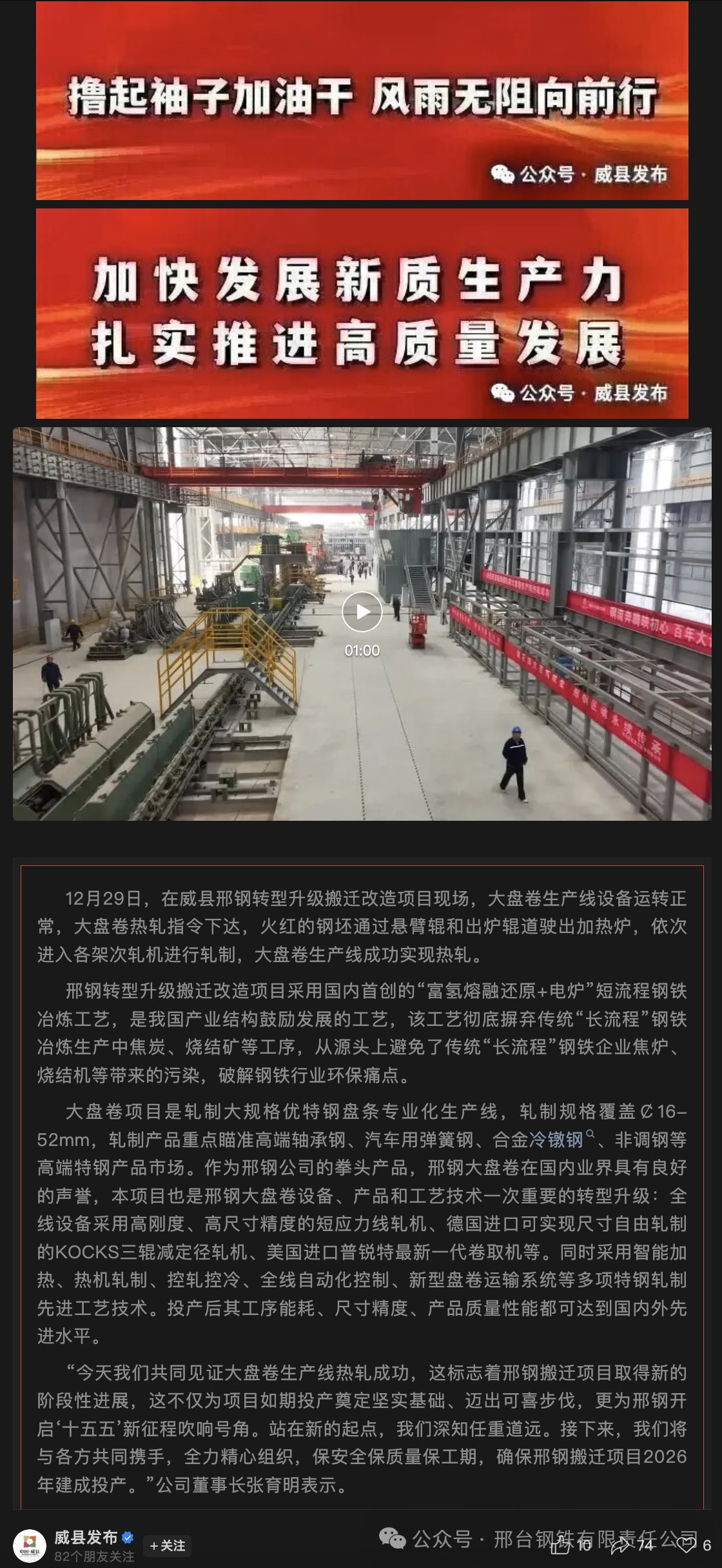 “今天我們共同見證大盤卷生產(chǎn)線熱軋成功,這標(biāo)志著邢鋼搬遷項目取得新的階段性進展,這不僅為項目如期投產(chǎn)奠定堅實基礎(chǔ)、邁出可喜步伐,更為邢鋼開啟‘十五五’新征程吹響號角。站在新的起點,我們深知任重道遠。接下來,我們將與各方共同攜手,全力精心組織,保安全保質(zhì)量保工期,確保邢鋼搬遷項目2026年建成投產(chǎn)。”公司董事長張育明表示。