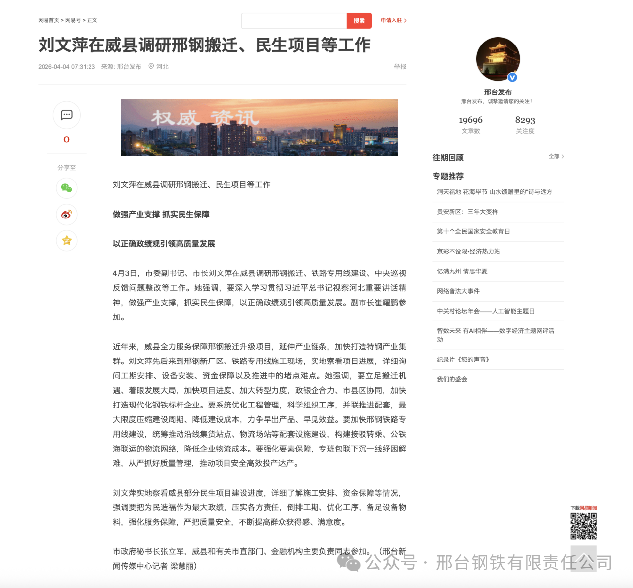 4月3日,市委副書記、市長劉文萍在威縣調(diào)研邢鋼搬遷、鐵路專用線建設(shè)、中央巡視反饋問題整改等工作。她強(qiáng)調(diào),要深入學(xué)習(xí)貫徹習(xí)近平總書記視察河北重要講話精神,做強(qiáng)產(chǎn)業(yè)支撐,抓實民生保障,以正確政績觀引領(lǐng)高質(zhì)量發(fā)展。副市長崔耀鵬參加。